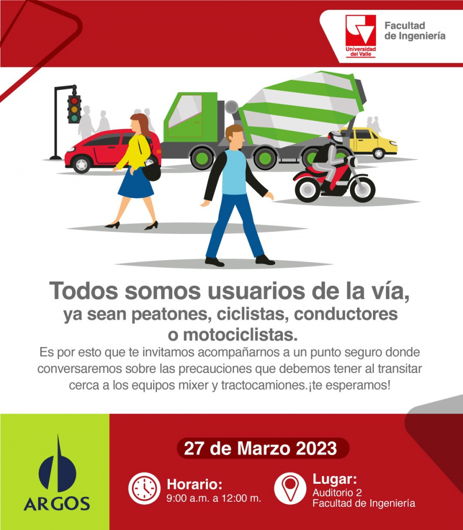Para el Plan Estratégico de Seguridad Vial es importante que la comunidad universitaria participe en espacios que fortalezcan nuestra seguridad y cultura vial; por lo anterior, se extiende la invitación a toda la comunidad universitaria a participar de la actividad de sensibilización de los actores viales frente a equipos Mixer y tractocamiones, brindada por la empresa ARGOS en coordinación con la Facultad de Ingeniería de la Universidad.